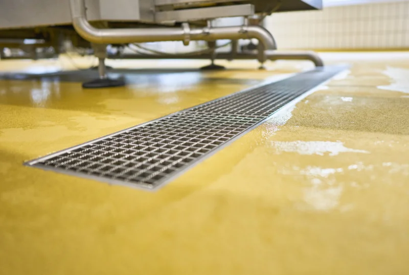 Neben Wasser und Reinigungsmedien wirken auch temperaturbedingte Spannungen sowie chemische Einflüsse auf die Bodenflächen ein. Heißwasserreinigung, Temperaturwechsel zwischen Produktions- und Reinigungsphasen sowie austretende Medien wie Kohlensäure, Fruchtsäuren oder alkoholhaltige Flüssigkeiten stellen hohe Anforderungen an Dichtheit und Materialbeständigkeit.